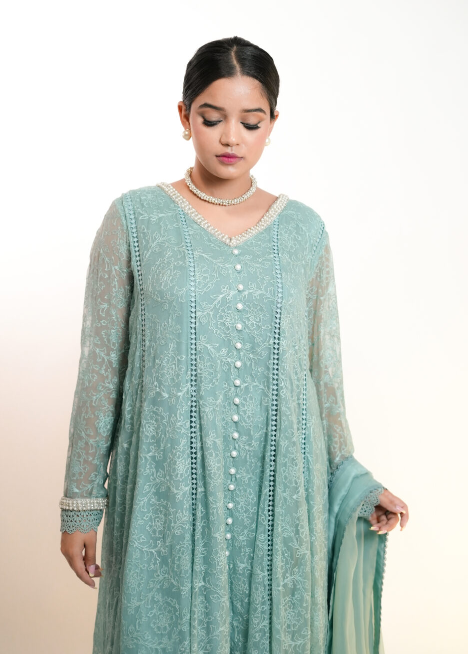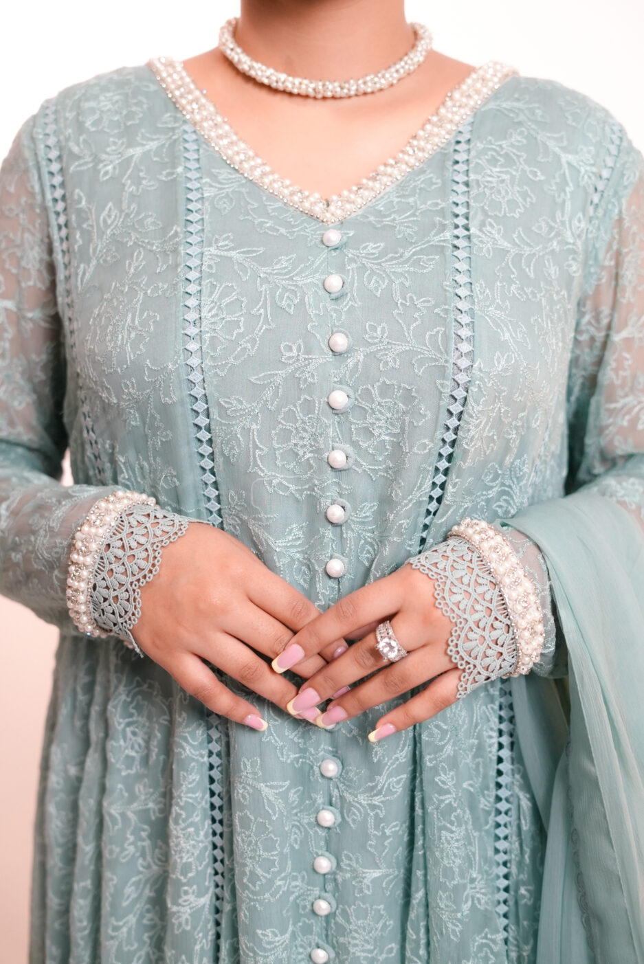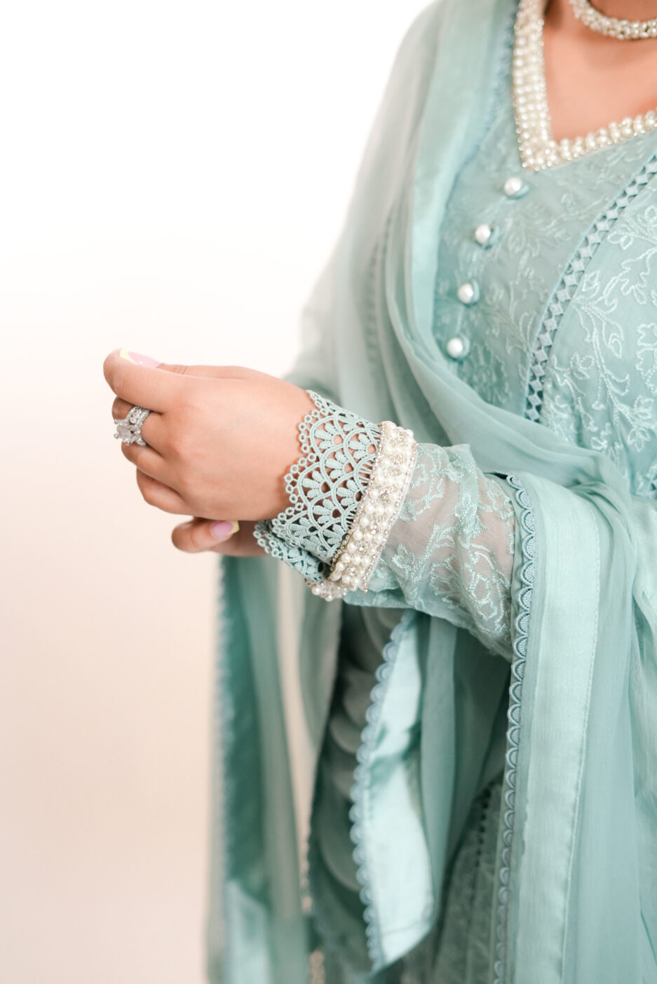 Soft light blue peshwas adorned with delicate embroidery and subtle pearl accents, Pearl whisper embodies understated elegance. The intricate detailing adds a touch of refinement, making it a perfect choice for daytime festivities or elegant evening soirées.