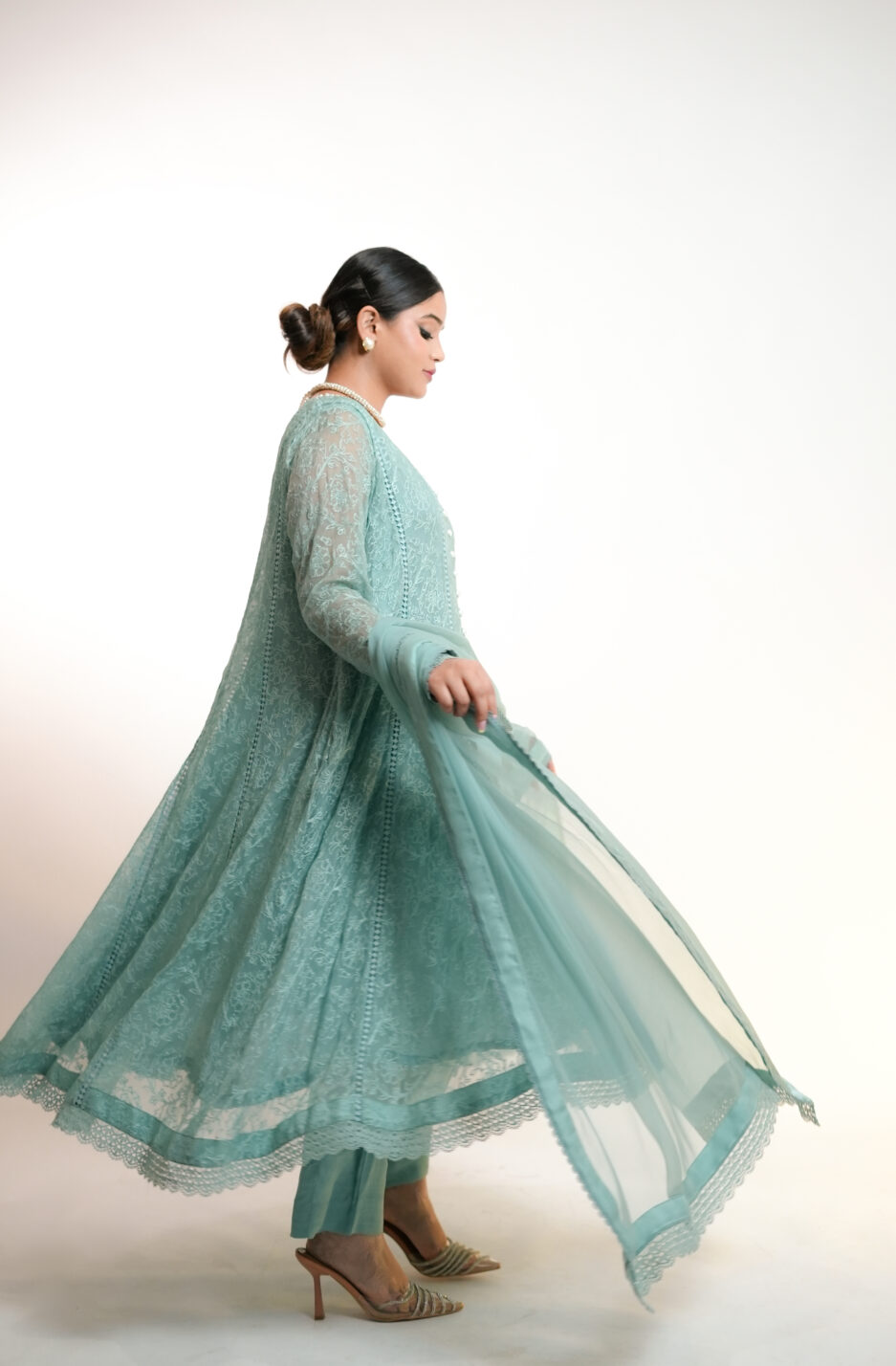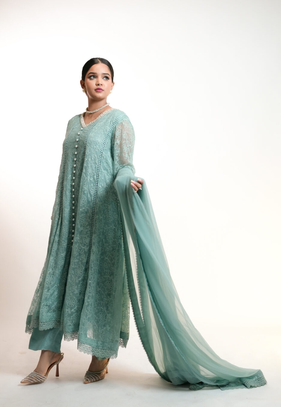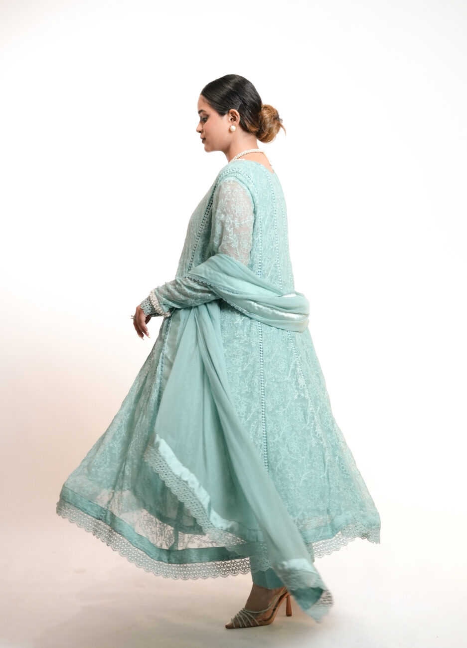 Soft light blue peshwas adorned with delicate embroidery and subtle pearl accents, Pearl whisper embodies understated elegance. The intricate detailing adds a touch of refinement, making it a perfect choice for daytime festivities or elegant evening soirées.